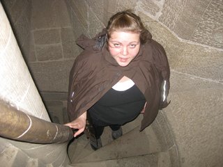 Ich stieg bis zur Turmspitze auf, um mich dort den Gewalten des Wetters entgegengesetzt wiederzufinden. Der Wind peitschte die Regentropfen einmal quer durch die fünf Mal fünf Meter große Plattform. Uncool. Vor allem auf dem Weg nach unten, dank der rutschigen Treppenstufen. Ich konnte mich gerade man so halten und den ungebremsten Absturz über 300 Meter Wendeltreppe zu verhindern.